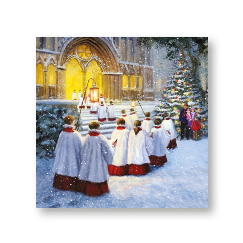 A pack of ten Christmas cards with envelopes, depicting a Christmas choral procession into the cathedral, set against a snowy evening scene.