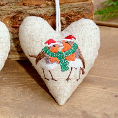 These embroidered cotton and linen hearts feature cheerful Christmas robins wrapped in cosy scarves, adding a touch of rustic warmth to your home.